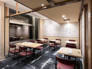 食堂の間仕切りとして連続折戸が採用されました。一般的な折戸との違いは滑車の位置です。連続折戸は滑車が中心に付いており、建具が傾くことがないので下レールを必要としません。また、全てがつながっており、蛇腹折りのように軽くたたむことができます。